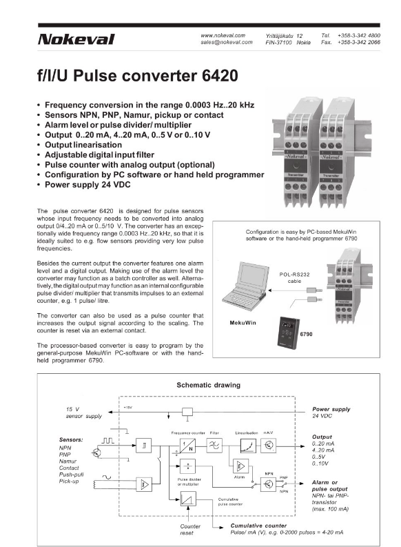 脈沖轉(zhuǎn)換器6420設(shè)計用于需要將輸入頻率轉(zhuǎn)換為0/4...20 mA或0...5/10 V模擬輸出的脈沖傳感器,該轉(zhuǎn)換器的頻率范圍非常寬,為0.0003 Hz...20 kHz,因此非常適合提供非常低脈沖頻率的流量傳感器。 除了電流輸出,轉(zhuǎn)換器還具有一個報警電平和一個數(shù)字輸出。利用報警電平,轉(zhuǎn)換器也可以作為一個批處理控制器來使用。另外,數(shù)字輸出可以作為一個內(nèi)部可配置的脈沖分壓器/乘法器,將脈沖傳輸?shù)酵獠坑嫈?shù)器,例如1個脈沖/升。 轉(zhuǎn)換器也可以作為脈沖計數(shù)器,根據(jù)縮放增加輸出信號。計數(shù)器通過一個外部觸點進行復(fù)位。 基于處理器的轉(zhuǎn)換器很容易通過通用的MekuWin PC軟件或手持式編程器6790進行編程。