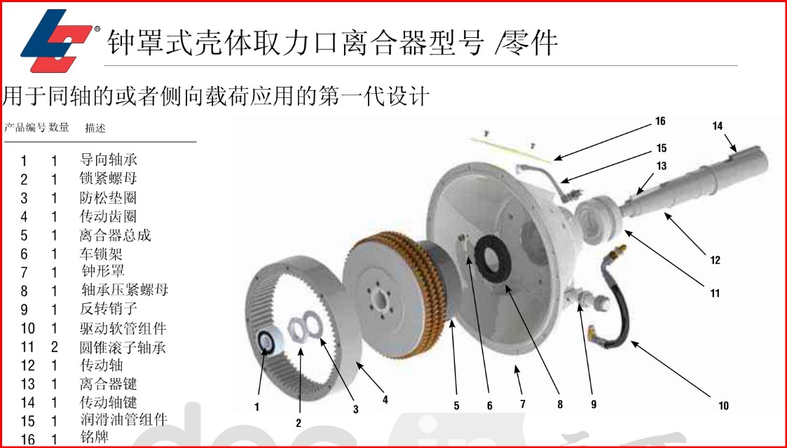 Logan氣/液驅(qū)動(dòng) 鐘罩式殼體取力口離合器式自調(diào)節(jié)的,設(shè)計(jì)成直接安裝到柴油發(fā)動(dòng)機(jī)或者汽油發(fā)動(dòng)機(jī)的飛輪上。摩擦圓盤組為干式應(yīng)用設(shè)計(jì)。通過(guò)一個(gè)固定的缸套-活塞布置或者通過(guò)內(nèi)置軸和離合器油道來(lái)完成。離合器的傳動(dòng)軸通過(guò)內(nèi)孔或鍵槽來(lái)安裝。扭矩從盤片組傳遞到安裝在發(fā)動(dòng)機(jī)飛輪上的齒輪傳動(dòng)齒圈上。Logan離合器主杠加壓, 推動(dòng)活塞夾緊或鎖住摩擦片或分離鋼片。當(dāng)壓力移走, 回位彈簧使摩擦片和鋼片分離, 當(dāng)鋼片和摩擦片分離后, 可以保持運(yùn)行間隙。